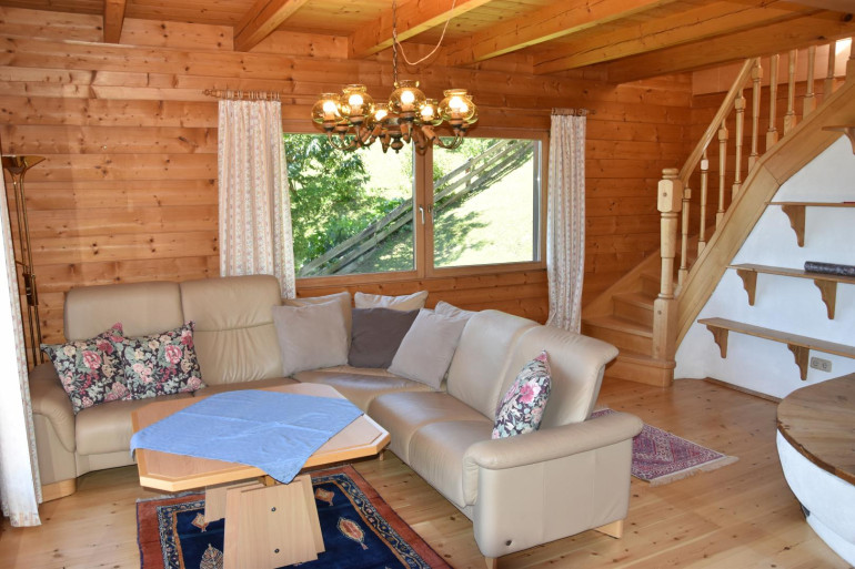 Über eine schmucke Holztreppe gelangt man in das Obergeschoss. Hier befindet sich ein großer, lichtdurchfluteter Wohnraum mit Ausgang zum Südbalkon. Auch hier eröffnet sich dem Betrachter ein einzigartiges Bergpanorama sowie ein fantastischer Ausblick auf den Millstätter See. Ein Schlafzimmer und ein kleines Badezimmer mit Dusche und WC befinden sich ebenfalls im Obergeschoss.