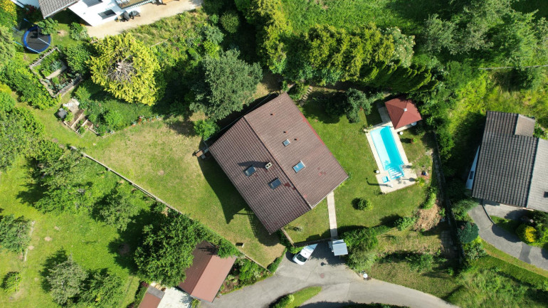 Das zweigeschossige Wohngebäude in Hanglage, welches unterkellert ist, hat nochmals ein Geschoss tiefer eine Garage, welche vom Süden her erreichbar ist.