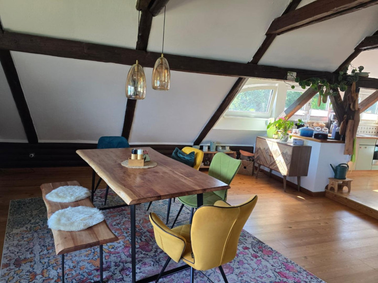 - Großes, rustikales Wohn- Esszimmer unmöbliert mit Südbalkon (ca. 6 m²)