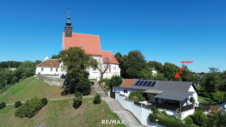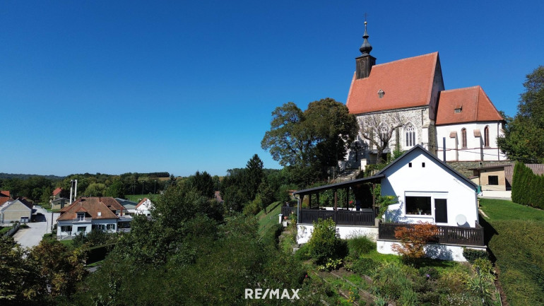 Direkt neben der Kirche gelegen, genießen Sie von der Terrasse einen traumhaften Panoramablick über Hannersdorf.