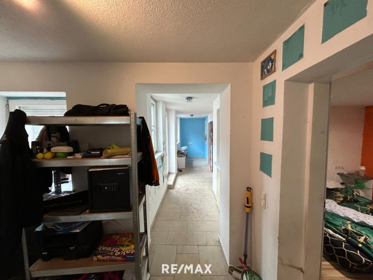 Am Ende des Durchgangszimmers befindet sich eine Ytongwand, die durchbrochen werden kann. Dadurch lässt sich der Schuppen direkt mit dem Wohnbereich verbinden – ideal für: