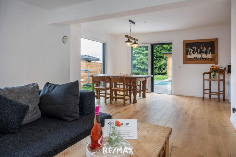 Das im Jahr 2022 errichtete Haus überzeugt durch seine durchdachte Architektur, exzellente Ausstattung und eine großzügige Terrasse mit Pool. Auf rund 131,5 m² Wohnfläche verteilen sich im Erd- und Obergeschoss drei helle Schlafzimmer, zwei stilvolle Badezimmer sowie ein offener Wohn- und Essbereich mit direktem Zugang zur Terrasse und zum Pool. Die moderne Küche mit Holzarbeitsflächen fügt sich perfekt ins Raumkonzept ein und sorgt für ein warmes, einladendes Ambiente.