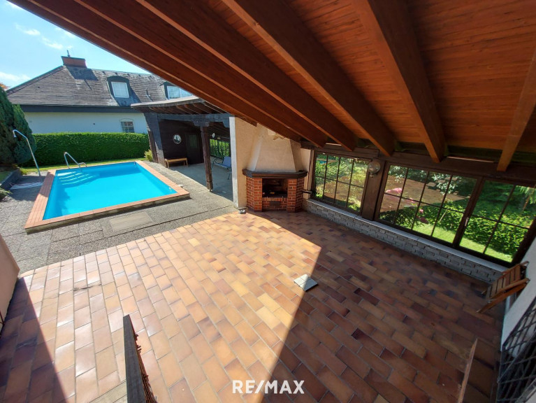 Das Herzstück der Liegenschaft ist der große Swimmingpool mit überdachter Terrasse und offenem Kamin, ein großer gepflegter Garten der zum Entspannen und Genießen einlädt. Dank der ruhigen und dennoch stadtnahen Lage vereint das Anwesen das Beste aus beiden Welten – Privatsphäre und schnelle Anbindung.