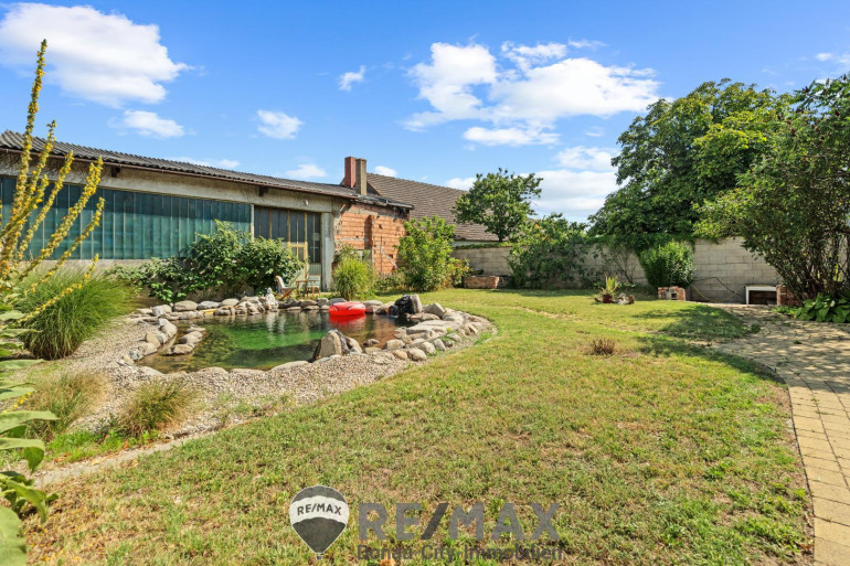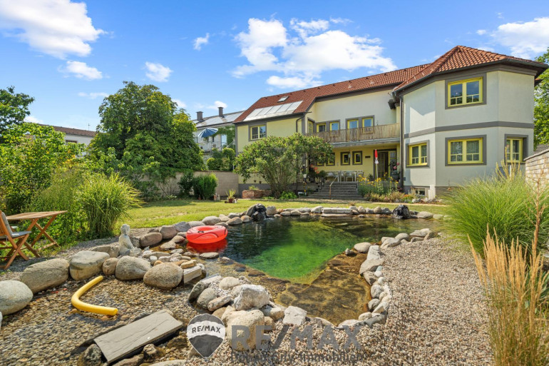Ein gepflegter Bio- Schwimmteich verleiht dem Garten ein idyllisches Flair und lädt zum Schwimmen, Spielen und Entspannen ein. Weiters steht ein Wasserbrunnen zur Gartenbewässerung zur Verfügung. Eine ca. 181 m² große Halle, welche sich an der hinteren Grenze des Grundstückes befindet, diente früher als Werkstatt und kann als ebensolche, oder als Garage, Lager oder Unterstellmöglichkeit für Boote und Autos genutzt werden.