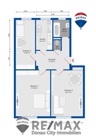 Der geräumige Wohnbereich lädt zum Verweilen und Entspannen ein. Die getrennt begehbare, moderne Küche bietet mit einem Frühstücksplatz neben dem Fenster den idealen Ort für einen kurze Auszeit.
