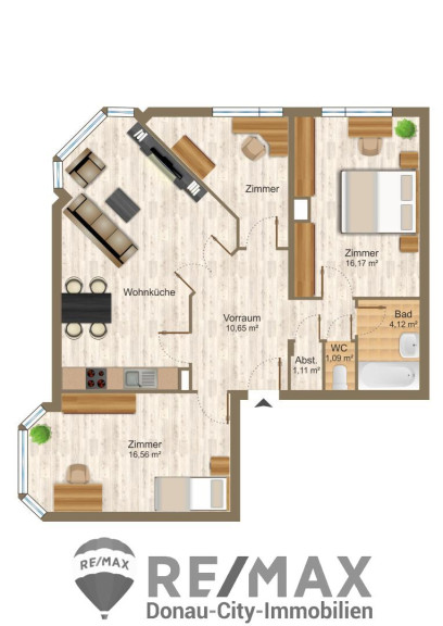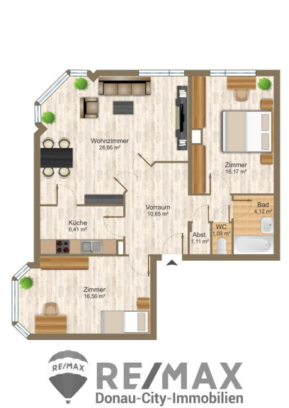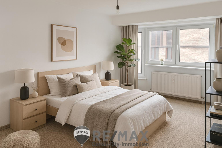 Sie ist derzeit als 3-Zimmer-Objekt ausgeführt, kann aber mit wenig Aufwand in eine vollwertige 4-Zimmer und zentral begehbare Wohnung durch sie umgestaltet werden (Plan).