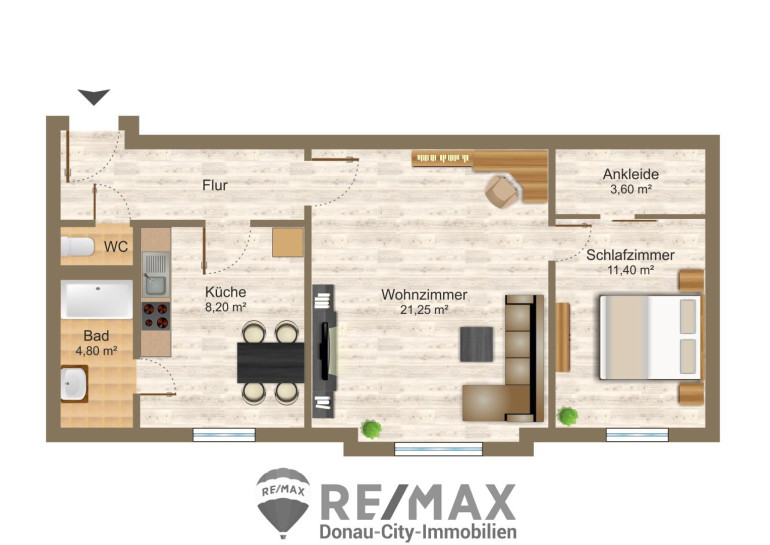 Von dort aus gelangen Sie in die vollmöblierte Küche, die mit allen notwendigen Geräten (Gasherd, Backofen, Kühlschrank, Mikrowelle, Tiefkühler, Gastherme) ausgestattet ist. Das Wohnzimmer bietet ausreichend Platz für eine gemütliche Einrichtung.