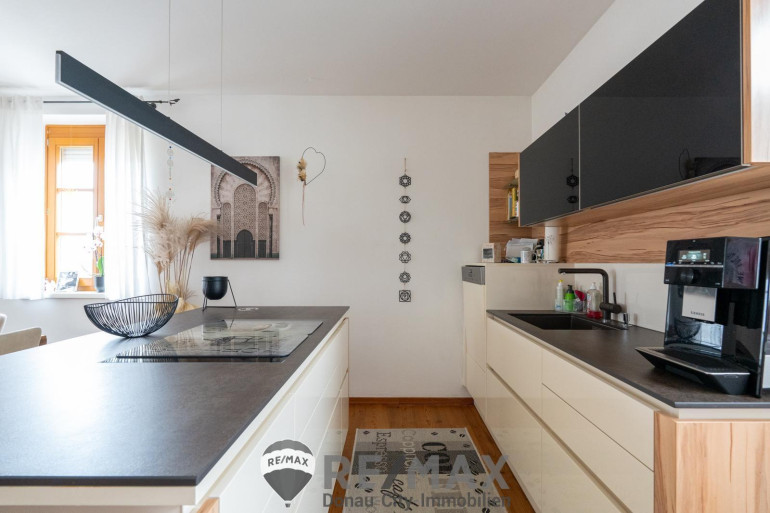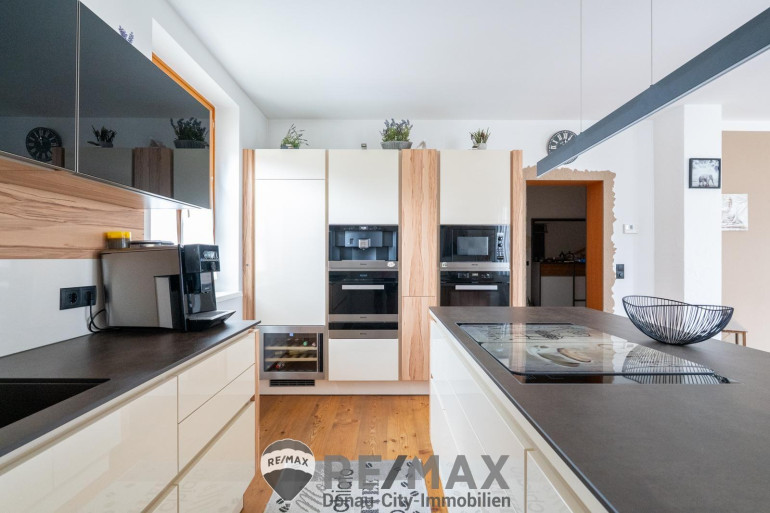 Bereits beim Betreten des Hauses wird klar: Hier wurde auf jedes Detail geachtet. Der Eingangsbereich bietet praktischen Stauraum mit einem Abstellraum sowie ein separates Gäste-WC. Herzstück dieser Ebene ist die großzügige Wohnküche – ausgestattet mit hochwertigen Einbaugeräten, modernen Drucksystem-Schrankfronten und viel Platz für gesellige Abende.