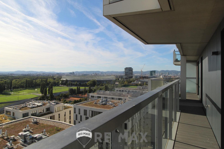 Located on the 14th floor of the prestigious Marina Tower, this corner apartment offers approx. 90 m² of living space including loggia. East- and south-facing loggias and terraces provide breathtaking panoramic views over Vienna and the Danube.