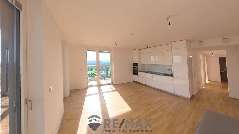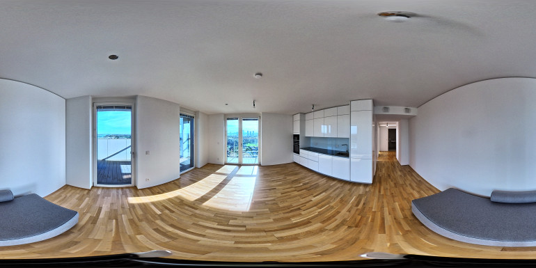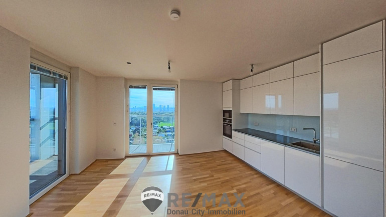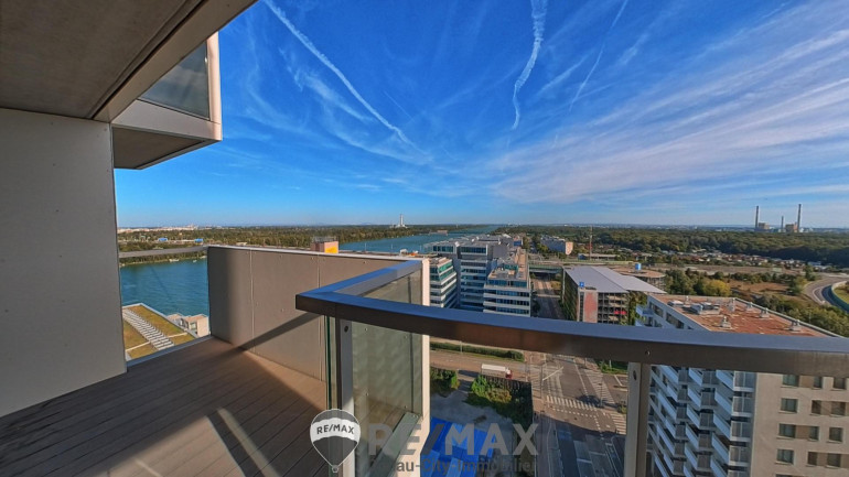 Im 14. Stock des Marina Towers erwartet Sie eine exklusive Eckwohnung mit rund 90 m² Wohnnutzfläche inklusive Loggia. Ost- und südseitig ausgerichtete Loggien und Terrassen bieten ein unvergleichliches Panorama über Wien und die Donau.