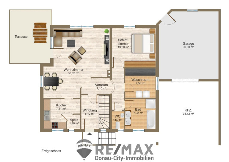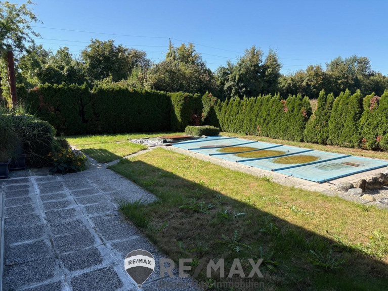 Für Autos wurde auch gesorgt – der Carport und die Garage liegen direkt an der Nachbargrenze. Hinter der Garage befindet sich eine überdachte Terrasse, ein Pool und ein kleines Biotop. Die Südterrasse ist direkt aus dem Wohnzimmer erreichbar.
