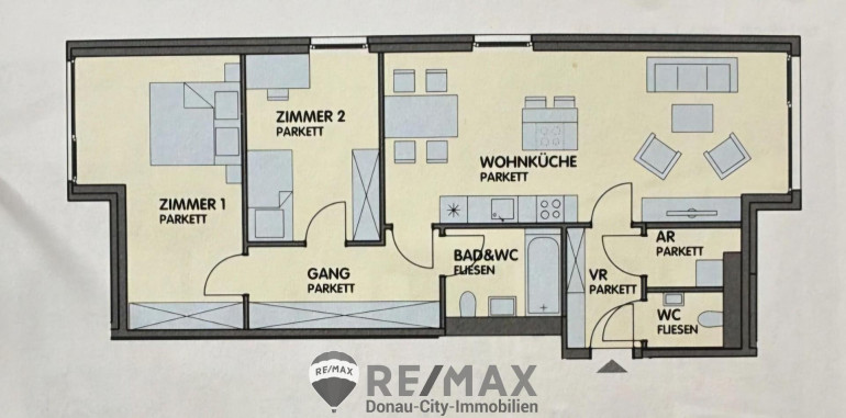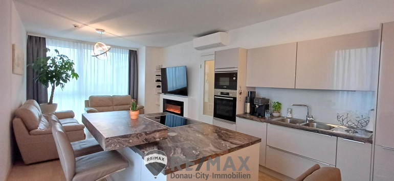 Der lichtdurchflutete Wohnbereich überzeugt mit bodentiefen Fenstern und großzügigem Schnitt. Die offene Raumgestaltung verbindet Wohnen, Essen und Kochen auf elegante Weise. Zwei weitere Zimmer eignen sich ideal als Schlafzimmer, Kinderzimmer oder Homeoffice. Hochwertige Materialien, ein edler Parkettboden und moderne Ausstattung sorgen für ein stilvolles Wohngefühl.