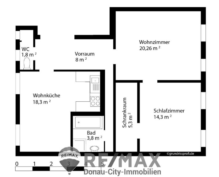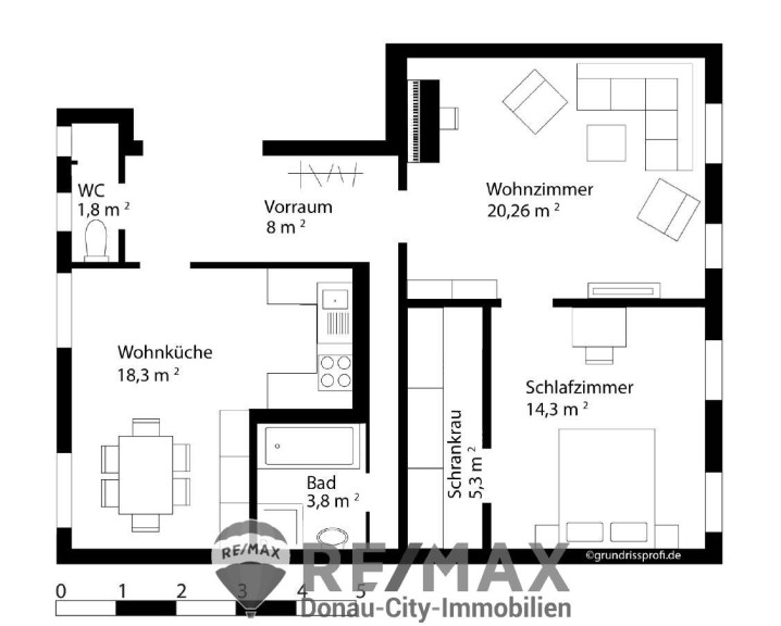 Raumaufteilung: Vorraum/Gang, Wohnzimmer mit Ausgang auf den Balkon, Schlafzimmer, Schrankraum, Badezimmer, Küche mit Essbereich, Separates WC