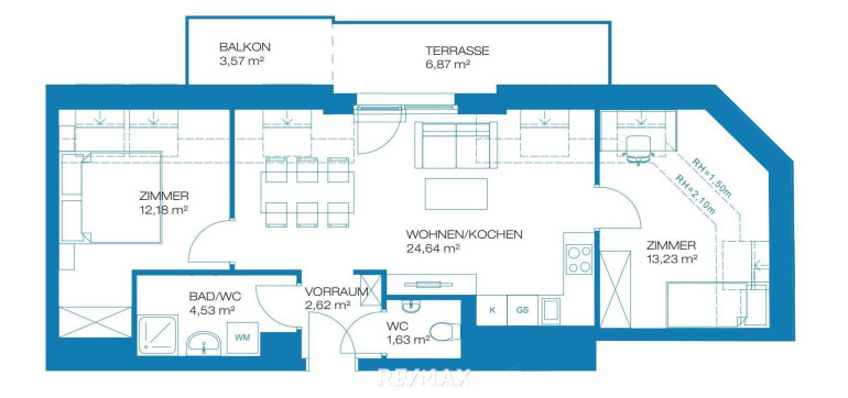geräumige Wohn-Küche ca. 25 m² und Zugang zur/zum ca. 9,5 m²-großen Terrasse/Balkon;