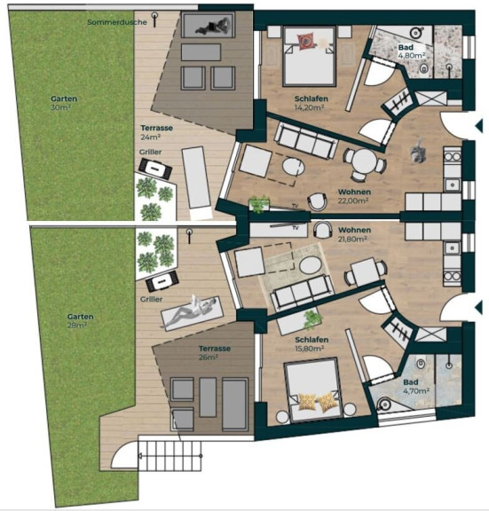 Die sonnigen Terrassenflächen bieten Ihnen auf rund 69m² genügend Raum zum Entspannen und Relaxen. Genießen Sie auf Ihrer Sonnenliege - zu Ihrem Lieblingsbuch, angenehmer Musik oder einem Sommerspritzer - die letzten Sonnenstrahlen romantischer Sonnenuntergänge. Ein Garten mit rd. 59m² sowie ein beheiztes Kellerabteil runden das umfangreiche Angebot ab. Beide Schlafzimmer verfügen über ein eigenes Bad sowie Zugang zu Ihrer gemütlichen Terrasse, welche zum Teil überdacht ist. Klingt verlockend? Ist es auch, denn diesen Luxus könnten Sie bald jeden Tag erleben.