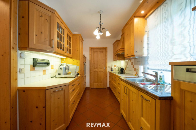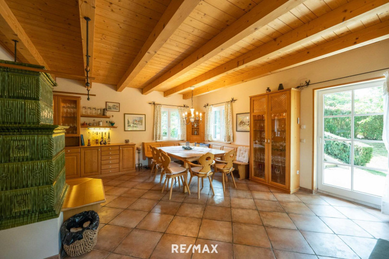 Das Erdgeschoss bietet neben Küche mit Speis und Gäste-WC vor allem das rund 30 m² große Wohn-Esszimmer mit traditionellem Kachelofen.