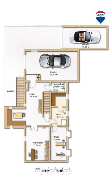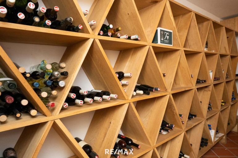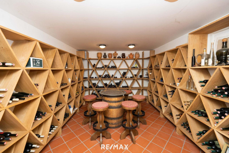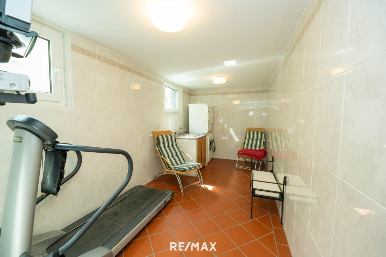 Der Keller überrascht als wahres Herzstück des Hauses: Neben dem Weinkeller gibt es einen einladenden Raum zum Zusammensitzen inkl Klappbett, eine eigene Sauna sowie einen Trainingsraum. Vom Keller aus gelangen Sie direkt in eine der beiden Garagen – ein praktisches Detail, das den Alltag erleichtert.