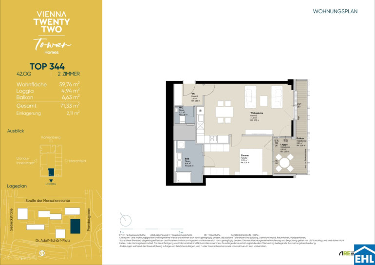In einzigartiger Lage, direkt bei der U1-Station Kagran und vis-à-vis vom Donau Zentrum, entsteht ein exklusiver, ca. 155m hoher Wohnturm mit 45 Etagen. Die insgesamt 347 Mietwohnungen bieten einen vielfältigen Wohnungsmix: von smart geschnittenen 1,5-Zimmer-Apartments ab ca. 38 m² über komfortable 2-Zimmer-Wohnungen bis hin zu großzügigen 3- und 4-Zimmerwohnungen mit bis zu ca. 80 m².
