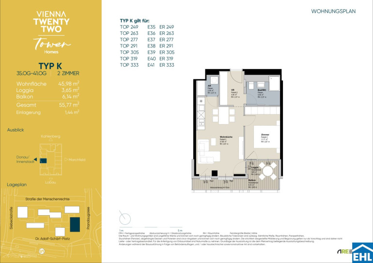 In einzigartiger Lage, direkt bei der U1-Station Kagran und vis-à-vis vom Donau Zentrum, entsteht ein exklusiver, ca. 155m hoher Wohnturm mit 45 Etagen. Die insgesamt 347 Mietwohnungen bieten einen vielfältigen Wohnungsmix: von smart geschnittenen 1,5-Zimmer-Apartments ab ca. 38 m² über komfortable 2-Zimmer-Wohnungen bis hin zu großzügigen 3- und 4-Zimmerwohnungen mit bis zu ca. 80 m².