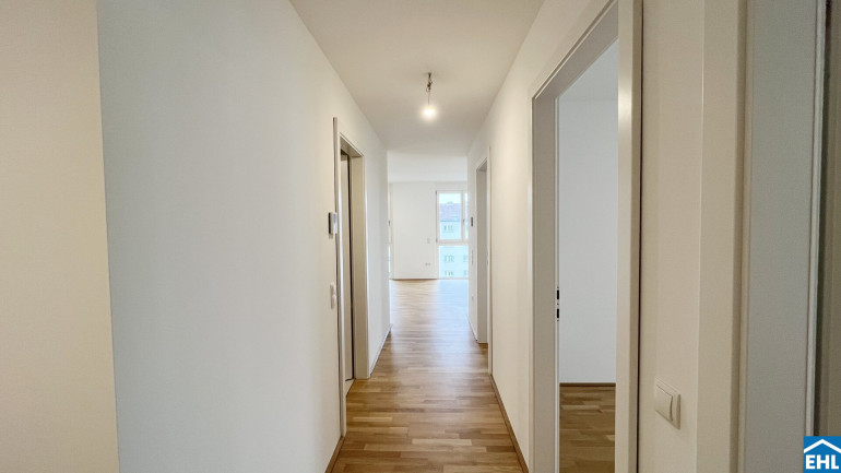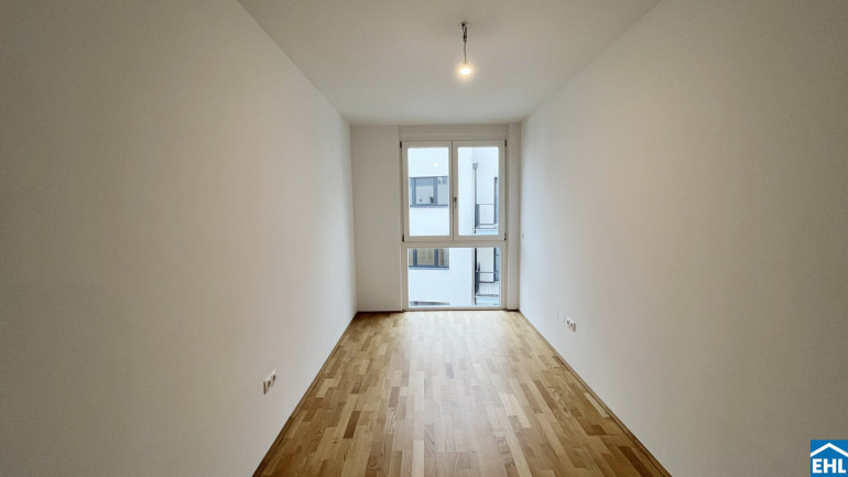 Eichenparkettböden, Holz-Alu-Fenster und Außenjalousien schaffen ein stilvolles Ambiente mit natürlicher Wärme. Dank Smart-Home-Vorbereitung, Fußbodenheizung und Raumkühlung über Bauteilaktivierung genießen Bewohnerinnen und Bewohner ein ausgewogenes Wohnklima zu jeder Jahreszeit.