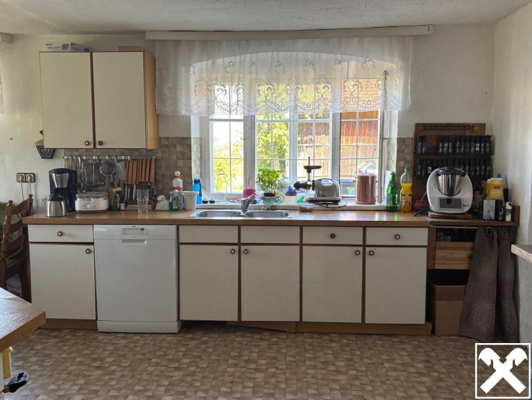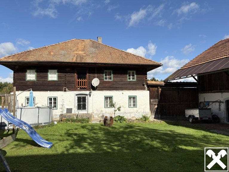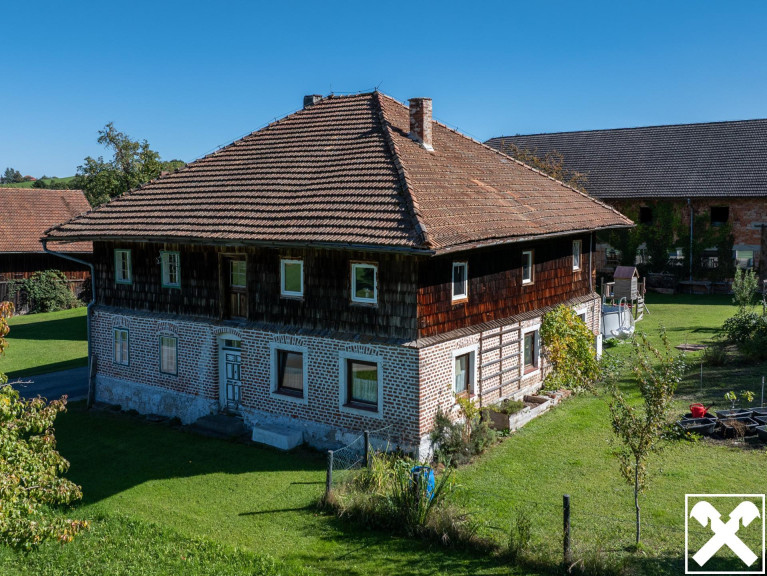 Das Wohnhaus wurde in gemischter Ziegel- und Holzbauweise errichtet und bietet ausreichend Platz für eine Familie. Es ist teilunterkellert und wird derzeit über Holzöfen beheizt. Das Gebäude ist sanierungsbedürftig, bietet jedoch großes Potential zur Wiederherstellung des ursprünglichen Bauernhaus-Charakters.