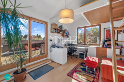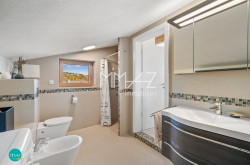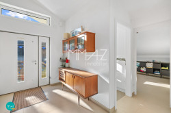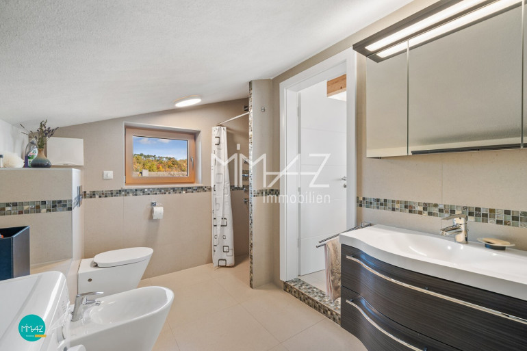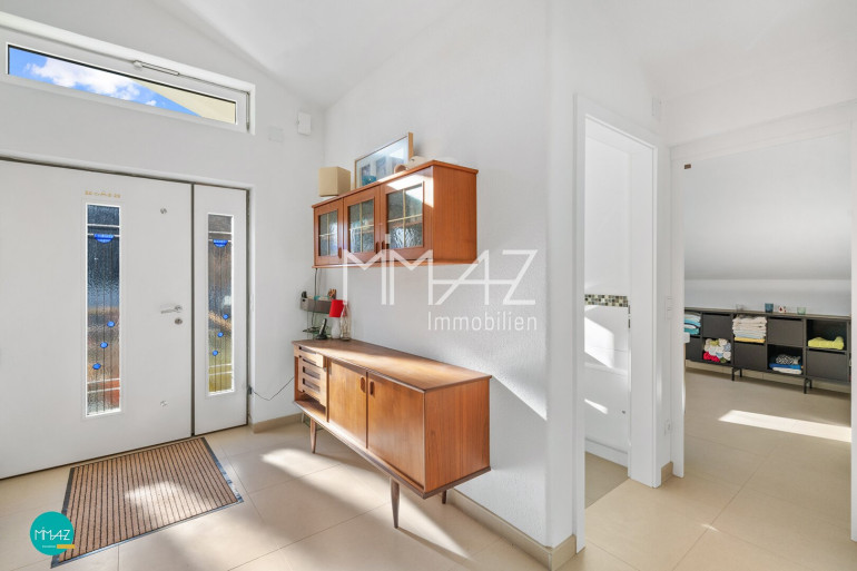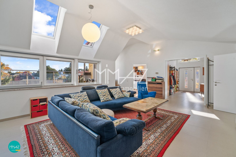 Vom Vorraum fällt der Blick direkt in den weitläufigen Wohnbereich mit beeindruckender Raumhöhe, drei Dachfenstern und dem Ausgang auf die erste von insgesamt drei Terrassen mit herrlichem Fernblick. Hier verschmelzen Luft, Licht und Weite zu einem einzigartigen Wohngefühl. Auch das Gäste-WC mit Handwaschbecken sowie das erste von zwei Badezimmern (mit Wanne) sind bequem vom Vorraum aus erreichbar.
