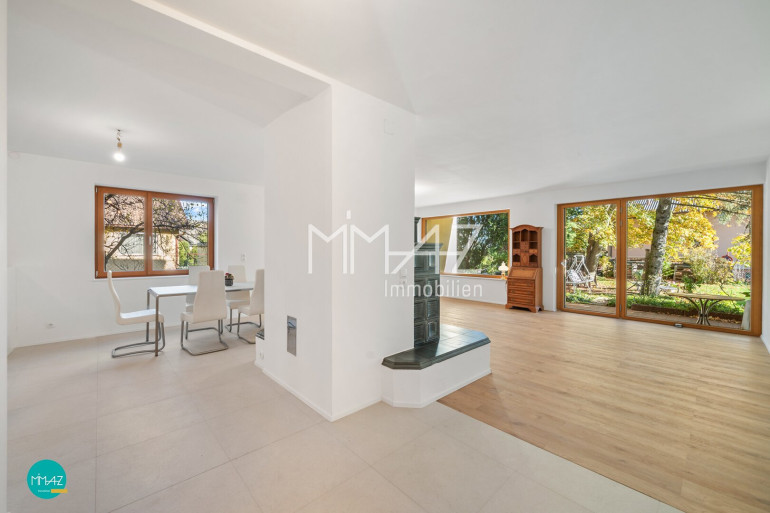 Eine neue, hochwertig ausgestattete Küche fügt sich harmonisch in den offenen Raum ein, während ein wunderschöner Kachelofen in der Mitte des Wohnzimmers nicht nur optisch begeistert, sondern in der kalten Jahreszeit für behagliche, gesunde Wärme sorgt.