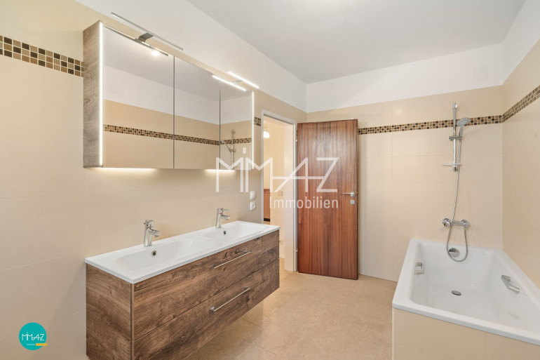 Das neu renovierte Badezimmer ist modern gestaltet und mit Badewanne, Doppelwaschtisch und Toilette ausgestattet.