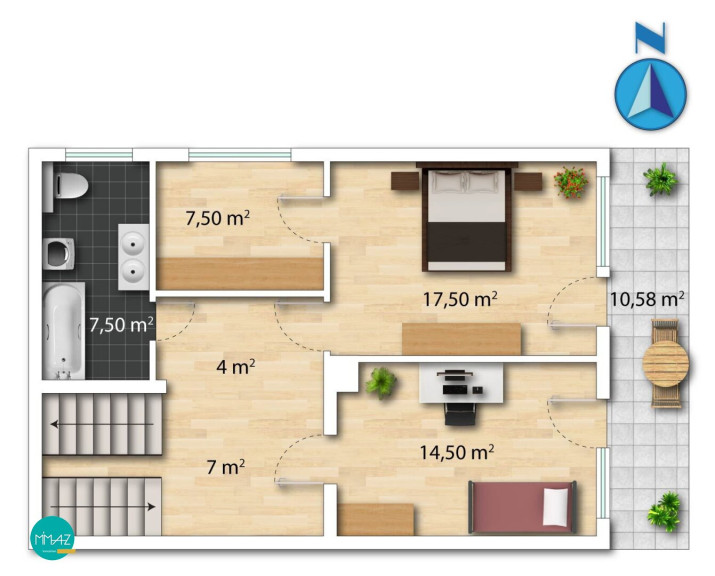 Eine Treppe führt ins Obergeschoss, das den privaten Rückzugsbereich dieser Maisonette bildet.
