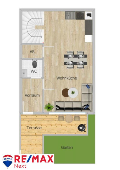 - Bodenbeläge: Feinsteinzeug in den Nassräumen, Parkettböden in den Wohnräumen, Holzbelag auf der Terrasse