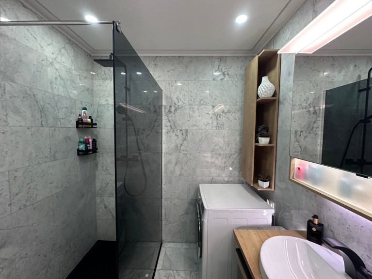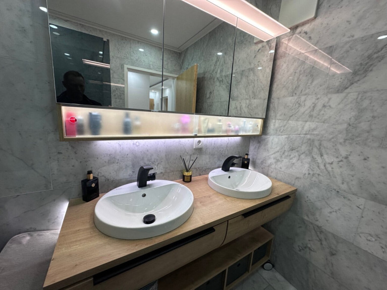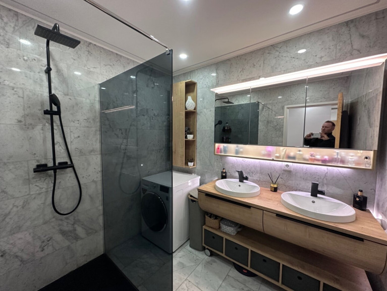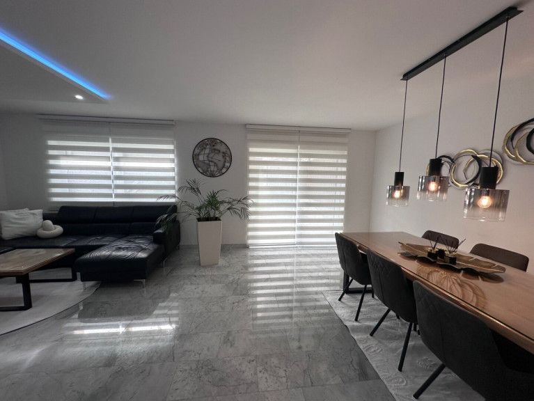Die gesamte Wohnung verfügt über Fußbodenheizung und wurde im Sommer 2023 vollständig saniert. Dabei kamen ausschließlich hochwertige Materialien zum Einsatz: Marmorböden, neue Badezimmer- und Sanitäreinrichtung, eine moderne Einbauküche sowie passgenaue Einbauschränke, die perfekt auf das Raumkonzept abgestimmt sind.