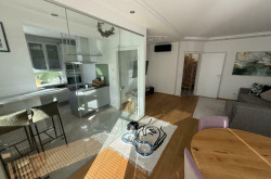 - Küche durch Glaswände elegant vom Wohnbereich getrennt - lichtdurchflutet und modern