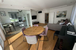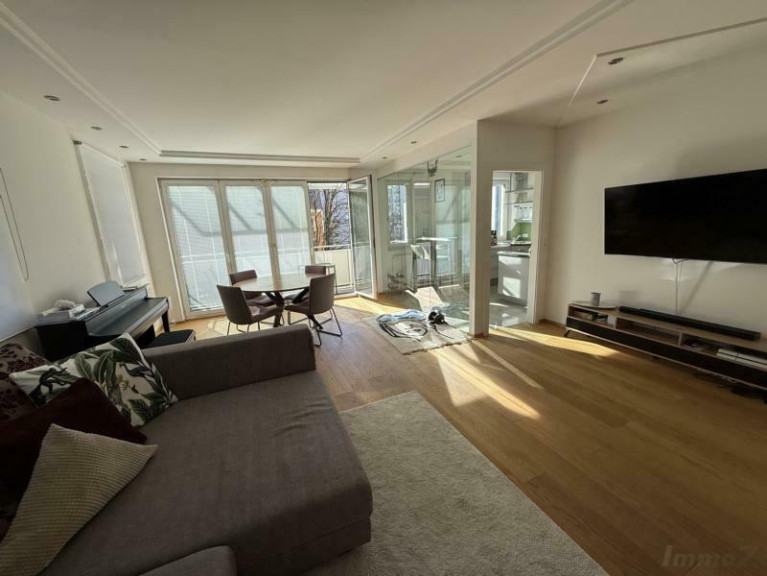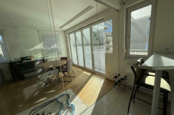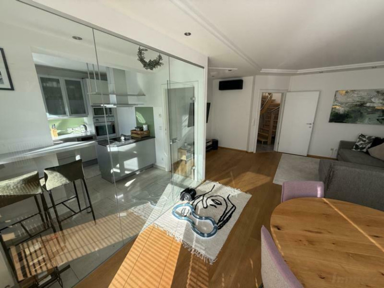 Der offene Wohn-Essbereich mit eleganter Glasabtrennung zur Küche, die edlen Dielenböden und der Zugang zum Balkon und zur Dachterrasse schaffen ein einzigartiges Raumgefühl voller Licht und Leichtigkeit.