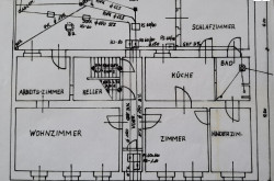 Im Erdgeschoß befinden sich 5 Zimmer, eine Küche (DAN-Einbauküche) mit Platz für einen Essbereich, ein Badezimmer mit Dusche, Badewanne und WC und eine Diele, wie auch der Abgang zum Keller (teilunterkellert) und dem Aufgang in den Dachboden.