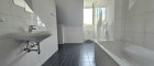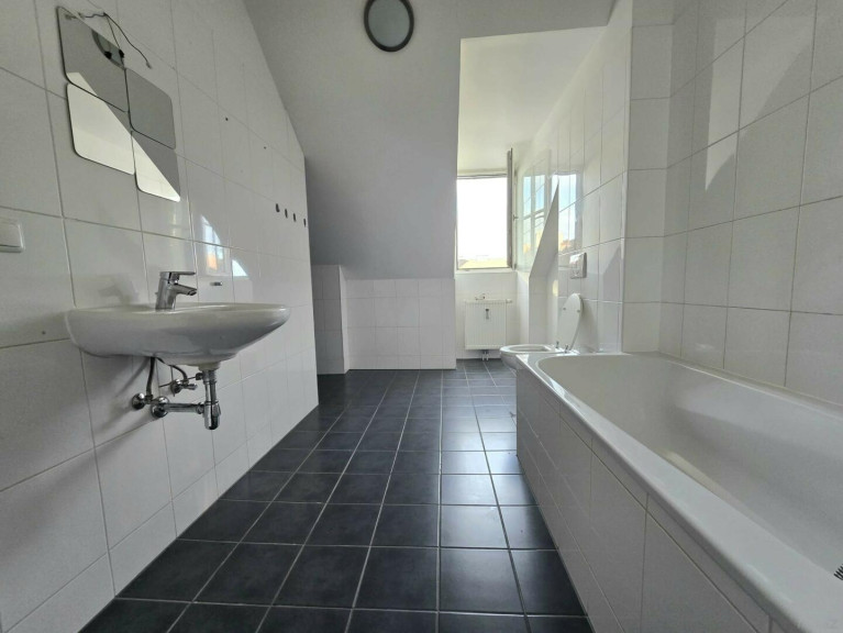 Die Wohnung verfügt über ein großes und helles Badezimmer mit Badewanne, Toilette und Waschmaschinenanschluss.