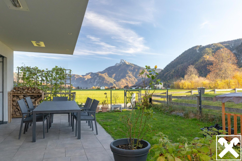 Vom Wohn- und Essbereich sowie von zwei Schlafzimmern (II und III) gelangt man direkt auf die Terrasse und weiter in den ca. 200 m² großen Garten. Auch vom Schlafzimmer I besteht ein direkter Gartenzugang. Der Garten bietet nicht nur viel Platz zur individuellen Gestaltung, sondern auch einen atemberaubenden Blick auf die imposanten Berge wie Drachenwand, Schober und Schafberg.