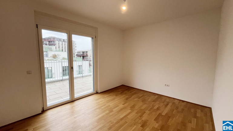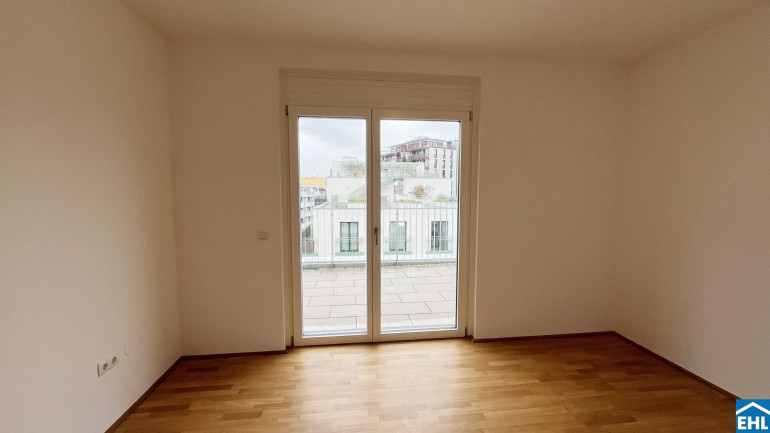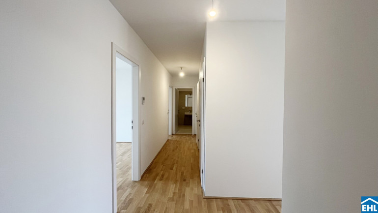 Eichenparkettböden, Holz-Alu-Fenster und Außenjalousien schaffen ein stilvolles Ambiente mit natürlicher Wärme. Dank Smart-Home-Vorbereitung, Fußbodenheizung und Raumkühlung über Bauteilaktivierung genießen Bewohnerinnen und Bewohner ein ausgewogenes Wohnklima zu jeder Jahreszeit.