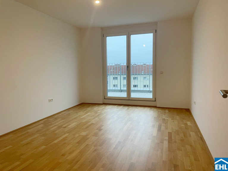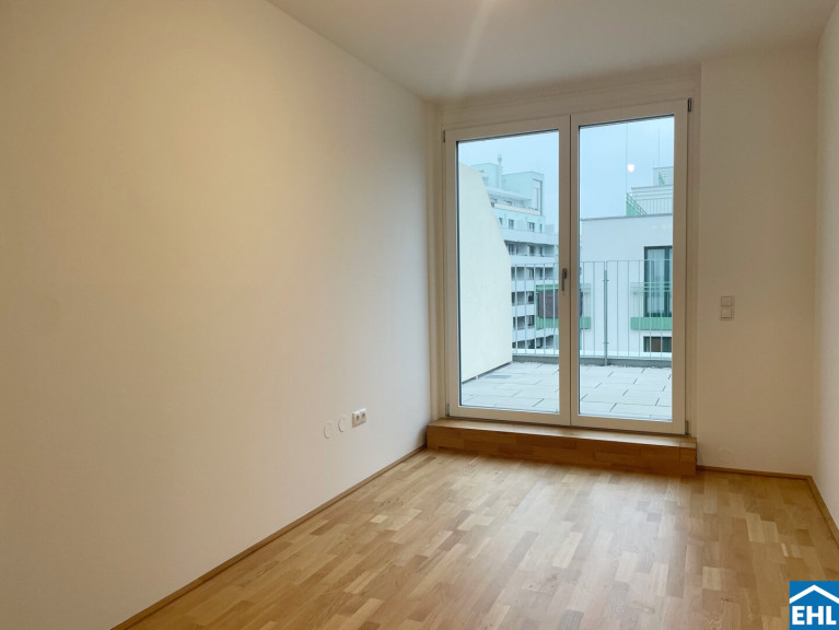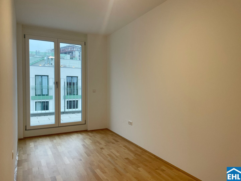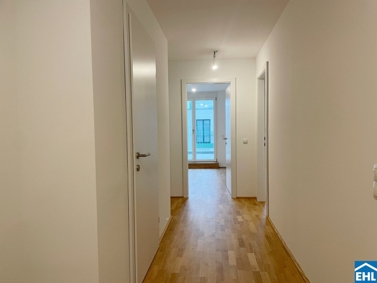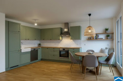 Eichenparkettböden, Holz-Alu-Fenster und Außenjalousien schaffen ein stilvolles Ambiente mit natürlicher Wärme. Dank Smart-Home-Vorbereitung, Fußbodenheizung und Raumkühlung über Bauteilaktivierung genießen Bewohnerinnen und Bewohner ein ausgewogenes Wohnklima zu jeder Jahreszeit.