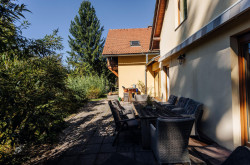Das Herzstück des Gartens bildet ein naturnaher Schwimmteich mit rund 50-60 m² Wasserfläche, eingefasst von einer großen Sonnenterrasse mit ca. 84 m² und Natursteinumrandung.