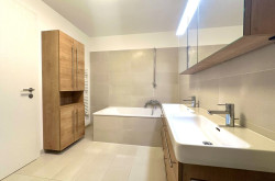 Die durchdachte Raumaufteilung, die mit hochwertigen Fliesen und elegantem Parkett ausgestattet ist, sorgt für ein stilvolles Wohnambiente. Ein großzügiges Badezimmer mit Badewanne und Dusche sowie eine Gästetoilette mit Handwaschbecken bieten zusätzlichen Komfort und Flexibilität im Alltag.