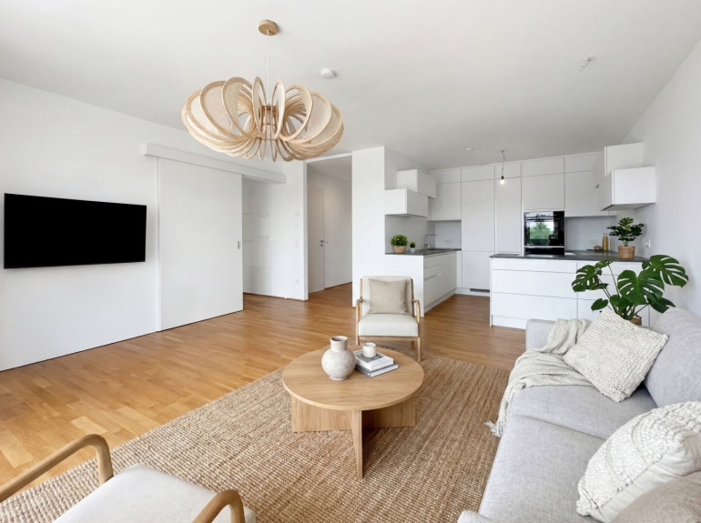 Mit insgesamt vier lichtdurchfluteten Räumen ist diese Wohnung ideal für Familien, Paare oder alle, die viel Platz und Komfort schätzen. Die offene Wohnküche mit moderner Einbauküche (Spüle, Backrohr, Dampfgarer, Cerankochfelder mit integriertem Dunstabzug, Kühlschrank und Tiefkühlschrank, Arbeitsplatte aus Strasser-Stein) lädt dazu ein, kulinarische Meisterwerke zu kreieren und unvergessliche Abende mit Freunden und Familie zu verbringen. Genießen Sie den Ausblick ins Grüne von Ihrem eigenen Balkon – ein wahrer Rückzugsort, der zum Entspannen und Verweilen einlädt.