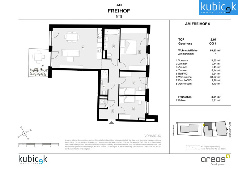 Das Projekt Am Freihof 5 / Kagraner Platz 50 vereint die Vorzüge urbanen Wohnens mit der Nähe zur Natur. Mit exzellenter Verkehrsanbindung, umfassender Infrastruktur und einem vielfältigen Freizeitangebot bietet dieser Standort alles, was modernes, komfortables und nachhaltiges Stadtleben auszeichnet. Ein Ort, an dem sich Lebensqualität, Mobilität und Erholung harmonisch verbinden – ein Zuhause mit Zukunft.