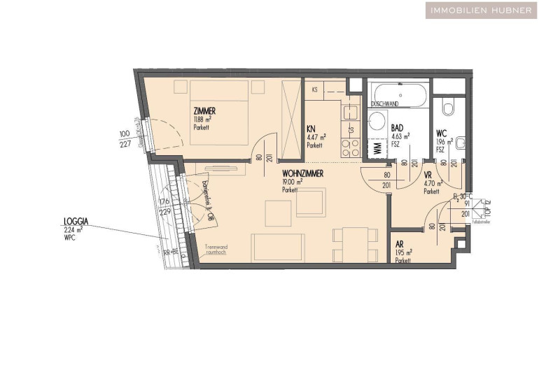 • Bad mit Badewanne (inkl. Duschmöglichkeit), Waschbecken und WM-Anschluss
