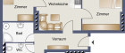 Die kompakte und komfortable Wohnung liegt im Erdgeschoß eines Mehrparteienhauses mit Lift. Das Wohnzimmer mit Küchenzeile bildet das Zentrum der Wohnung, an das die beiden anderen Zimmer angrenzen. Die Wohnräume sind ostseitig ausgerichtet. Das innenliegende Badezimmer ist mit einer Dusche ausgestattet. Ein Waschmaschinenanschluss ist vorhanden. Das WC ist in einem separaten Raum. Es gibt einen Abstellraum.