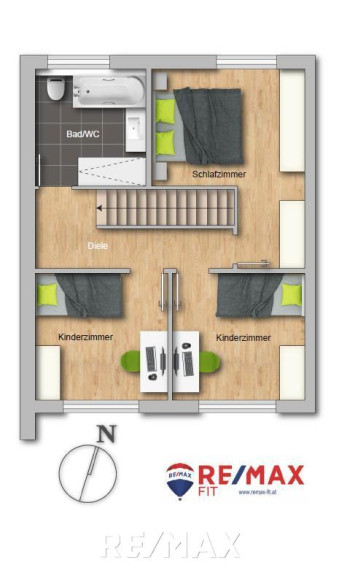 • Obergeschoss: Hier erwarten Sie ein geräumiges Schlafzimmer, zwei weitere Zimmer, die flexibel als Kinder-, Arbeits- oder Gästezimmer genutzt werden können, sowie ein modern ausgestattetes Badezimmer mit Badewanne, Dusche und WC. Die Diele sowie elektrisch zu öffnende Dachfenster mit Raffstores runden das Raumangebot ab.