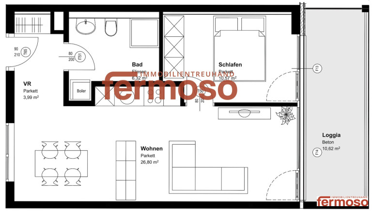 Die offene Wohnküche mit Essbereich und gemütlicher Sofaecke bildet das Herzstück der Wohnung. Das separate Schlafzimmer bietet Rückzug und Privatsphäre, während das Badezimmer mit Waschmaschinenanschluss und das getrennte Vorzimmer für funktionale Wohnqualität sorgen.