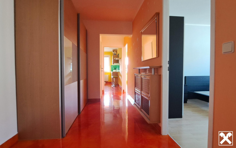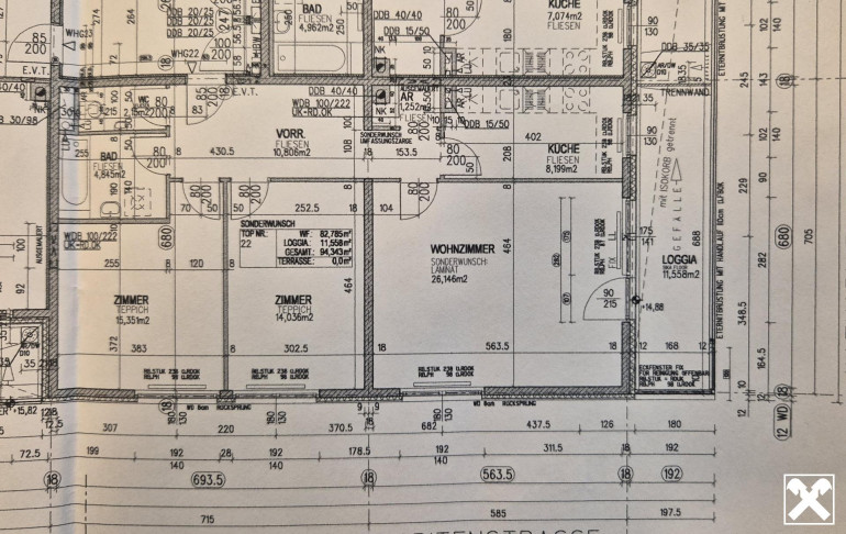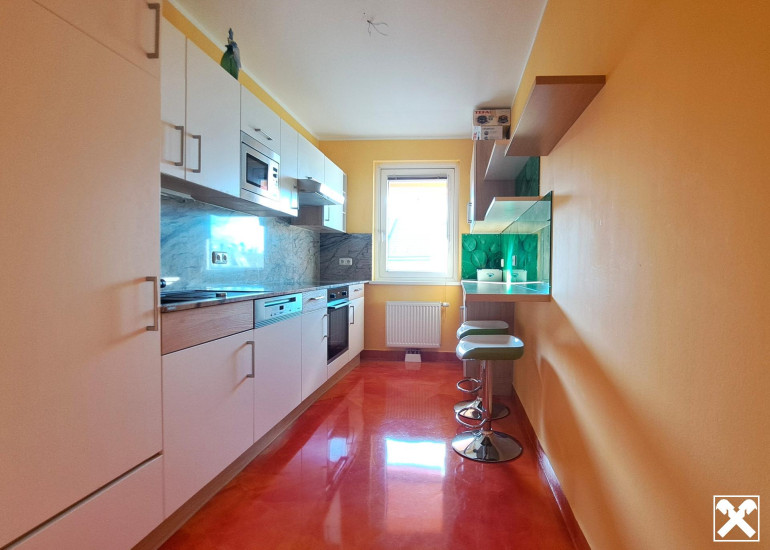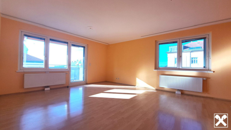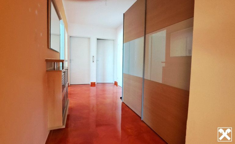Beim Betreten erwartet Sie ein großzügiger Vorraum, von dem aus alle Räume zentral begehbar sind. Das südseitige Wohnzimmer bildet das Herzstück der Wohnung und öffnet sich auf eine fast 12 m² große, sonnige Loggia, die zum Entspannen und Verweilen einlädt.