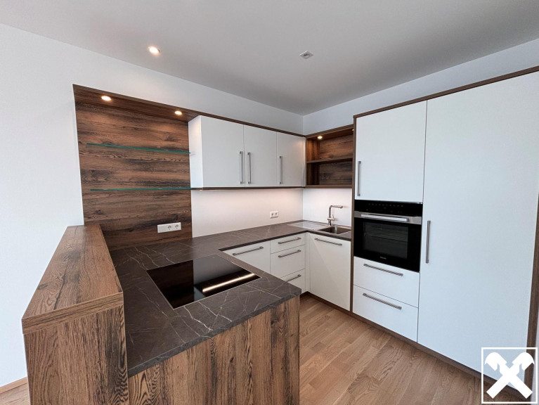 Der helle Wohnbereich mit offener Küche überzeugt mit einer freundlichen, einladenden Atmosphäre und ermöglicht durch die großen Fensterflächen einen direkten Zugang zur weitläufigen Loggia. Dieser bietet ausreichend Platz für gemütliche Sitzbereiche, Pflanzen oder entspannte Stunden an der frischen Luft.