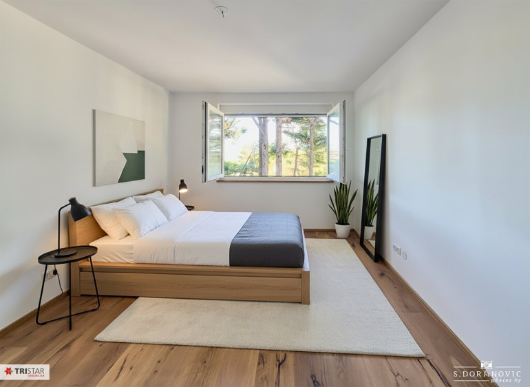 Zur hochwertigen Ausstattung gehören Eichenparkettböden, Vorbereitung für Klimaanlage, Kunststoff-Alu-Fenster mit 3-fach Isolierverglasung und mit integriertem Sonnenschutz.