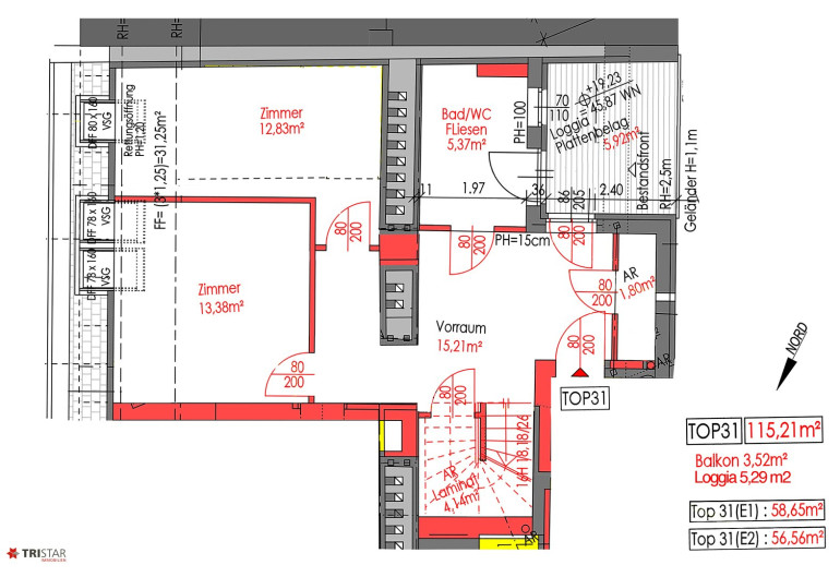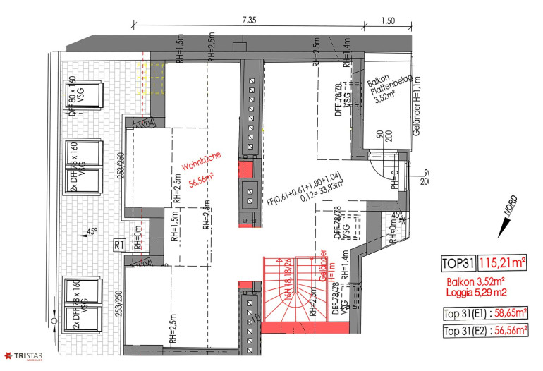 - Top 31: Wohnfläche ca. 115,21 m² + Terrasse ca. 3,52 m² + Loggia ca. 5,97 m², EUR 849.000